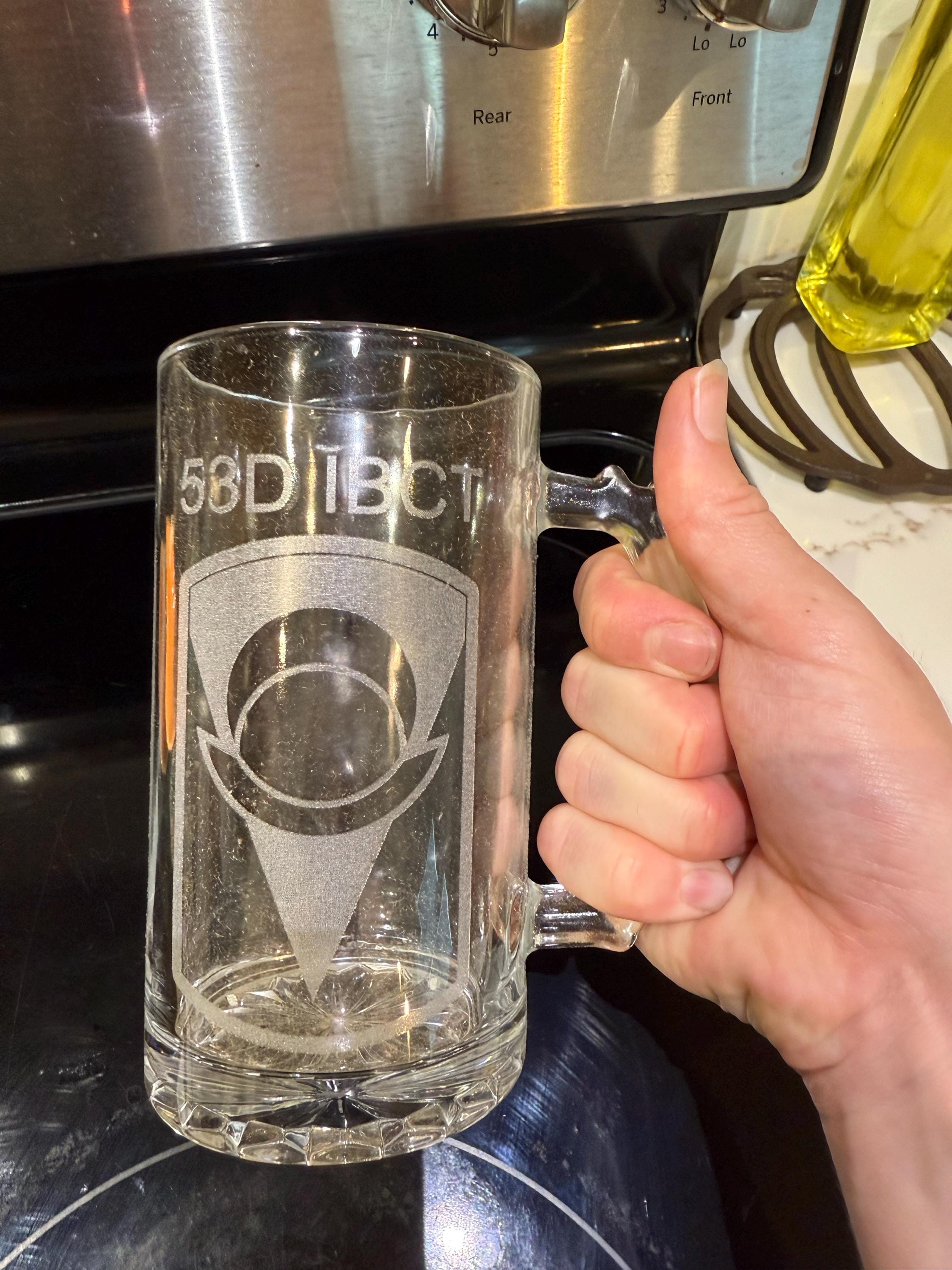 Personalized engraving on a 16oz beer mug with handle. We at Design-Engrave can engrave your monogram or logo into the glass. Each glass has long lasting engraving and is dishwasher safe. Feel free to ask any questions. Wanting bulk? Ask about bulk discounts. All bulk orders may be shipped FedEx.